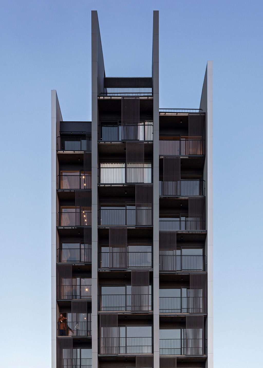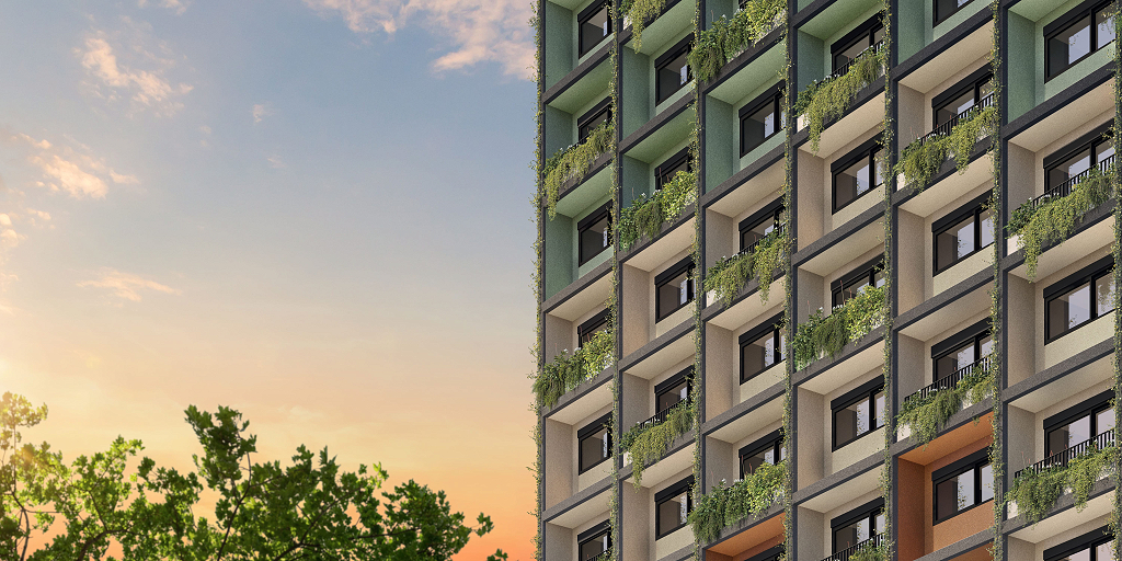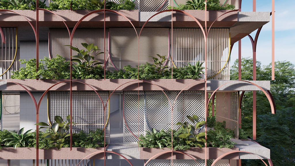 Buscamos reforçar a relação entre interior e exterior, e assim, oferecer aos usuários a sensação de pertencimento ao meio urbano, mas sem abrir mão do conforto e privacidade de suas casas. Para buscar essa relação, foram utilizados terraços em ambas as extremidades do prédio. Esses terraços foram articulados entre si de maneira a não se sobreporem, dando a cada unidade uma amplitude espacial em todas as direções e, ao mesmo tempo, criando uma dinâmica da fachada que determina o caráter da edificação. Esse movimento cria uma percepção muito desejada, uma sensação de "casa". Na ponta mais estreita, tem-se o jardim. Na outra, mais larga, é possível se colocar um espaço de estar muito confortável.