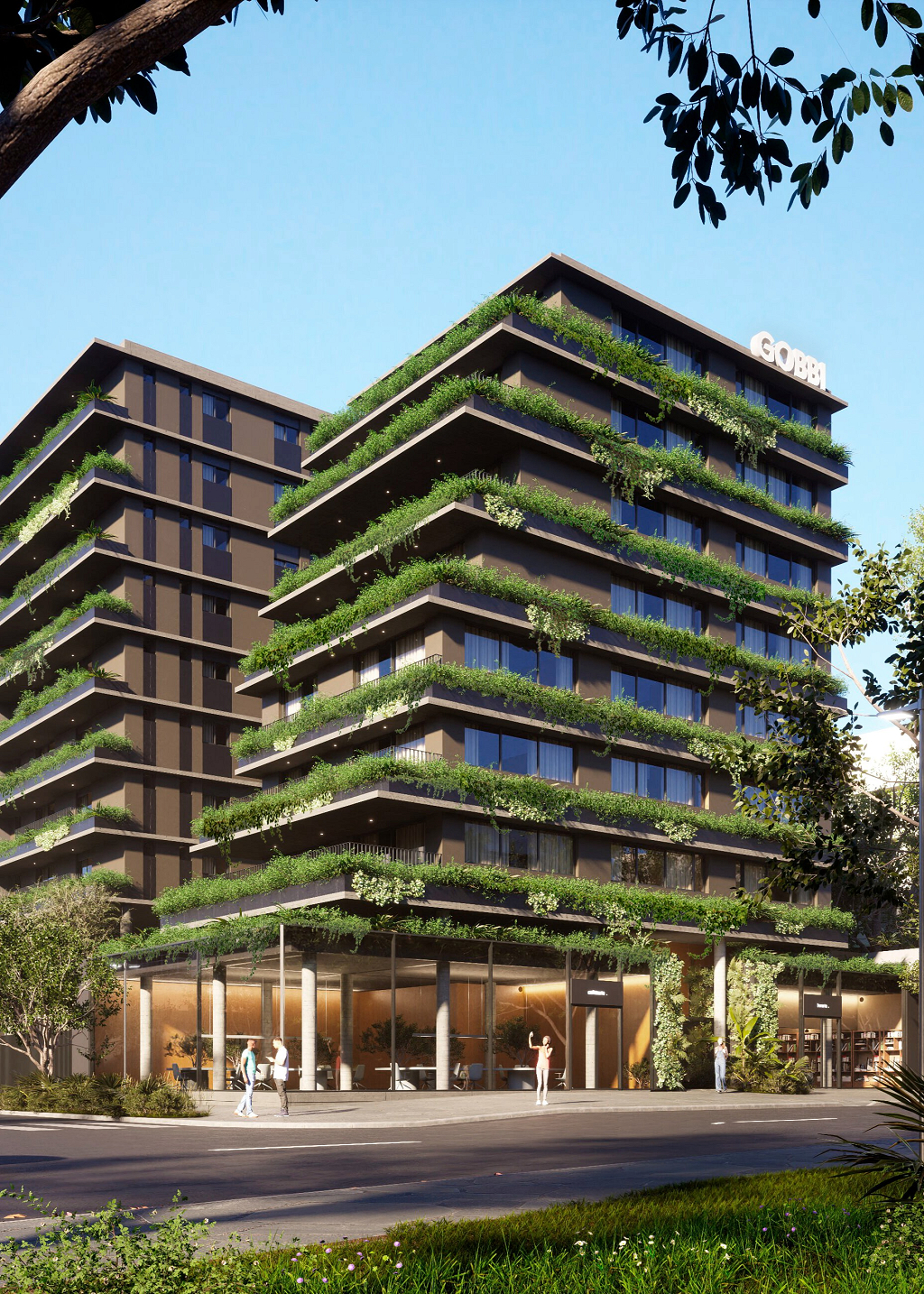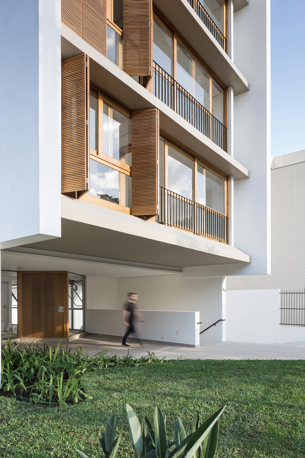 Por fim, a ideia de conexão urbana, onde entendemos o edifício como parte de um contexto. Em consonância com a ideia de abertura ao exterior, obtida por meio dos terraços, buscamos configurar o acesso com a mesma premissa. Criando um caminho aberto desde o passeio público à porta de acesso da área privada, já meio do lote. Neste percurso, a transição é feita por um caminho sobre um espelho d'água, criando um espaço contemplativo também para as pessoas que passeiam pela rua. Entendemos esse gesto como uma gentileza urbana, um "respiro" na calçada, ato este muito pouco explorada pelos novos empreendimentos.